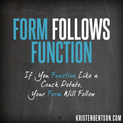 Form Follows Function. If you function like a couch potato, your form will follow. It’s time to get off the couch, throw away the potato chips, and function like you’ve never functioned before. Here’s the deal. You can lose fat by changing the way you eat, BUT (notice my big but!) changing the way you eat will not help you to gain muscle. Muscle is the key to revving up your metabolic engine, preventing injury and improving your overall strength. Plus, when you move your body regularly and with vigor, you reduce your risk of all the scariest of the scary conditions like cancer, diabetes and heart disease. (hello—really, who wants to deal with those?!?)