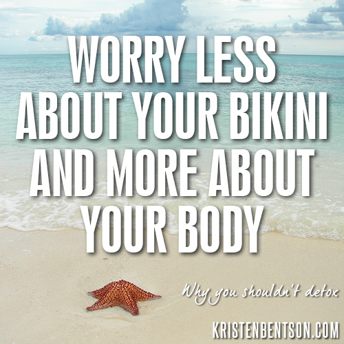 Want to really get your body beach ready?!? Try this on for size. Learn how to eat to your metabolism (take in just the right amount of calories for your body) and choose fabulously high quality, nutrient rich foods. Consistently eat clean foods and you won’t have to even worry about “detoxing.” ( FYI: your liver really does take care of you. You’re best detox defense is a good offense. Don’t eat the garbage, chemicals, preservatives, sugar, and dyes to begin with.)
