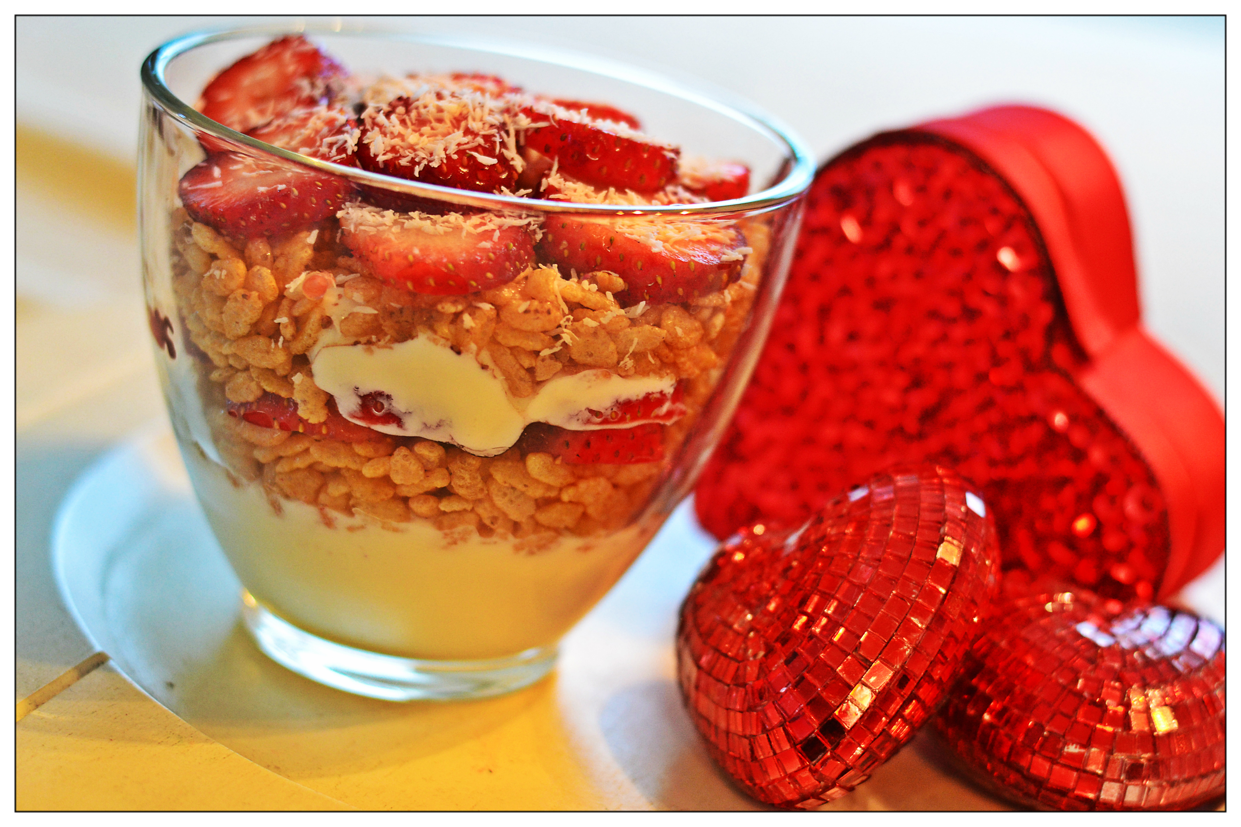 Let’s put a few of my favorite heart healthy foods (like cocoa, honey, brown rice, yogurt and strawberries) together to make a delicious little parfait you’ll want to eat over and over again!